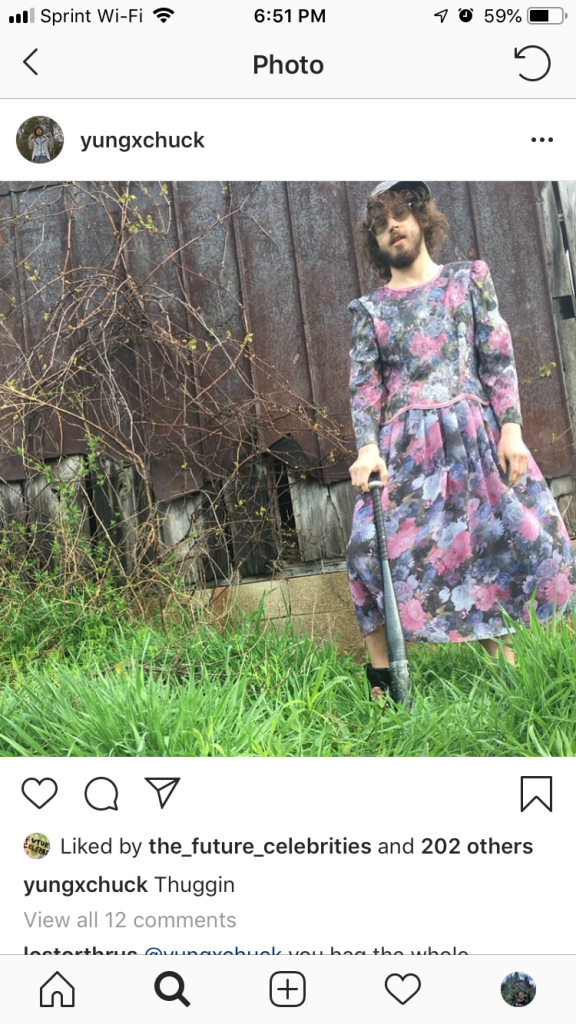 I first met the legend that is Yung Chuck in 2014, when I was living in the dorms at Carroll University. He lived two doors down from me, and had this dope green spiky dinosaur backpack that I hope he still has. Chuck immediately became a staple on campus, his vibrant personality and humor affecting everyone he interacted with. My neighbor, Chuck, and I developed a reputation pretty quickly among the resident assistants, and we would have to leave the dorms to do anything fun because they would hover around our doors(probably justified). Yung Chuck moved left the school after only one semester, but he left an impression on so many people. I always believed he would end up being internet famous because his personality is perfect for it. Cut to last year, when I first started noticed he was making music. I really dug his sound because it is just so different; he switches genres from song to song, in fact mashing genres together in some songs. Hey, without people pushing the boundaries of what music is supposed to sound like, we would never find new ways to make music. What if the Beatles had never pushed their boundaries to make Sgt Peppers? Yung Chuck could be the new Beatles, we don’t know right now(do not @ me).Yung Chuck’s Instagram page is just as eccentric and exciting as his music. He regularly posts photos of different characters he creates, crossing the line between, man, female, and thing, in a comical and really great way. He often creates story lines you can follow with this characters as well, making following him a fun experience. I strongly encourage everyone to follow his Instagram, you will not be disappointed at all. I firmly believe Yung Chuck is on his way to being a star, whether it is with his music or with his Instagram, or both, and I am excited for it.