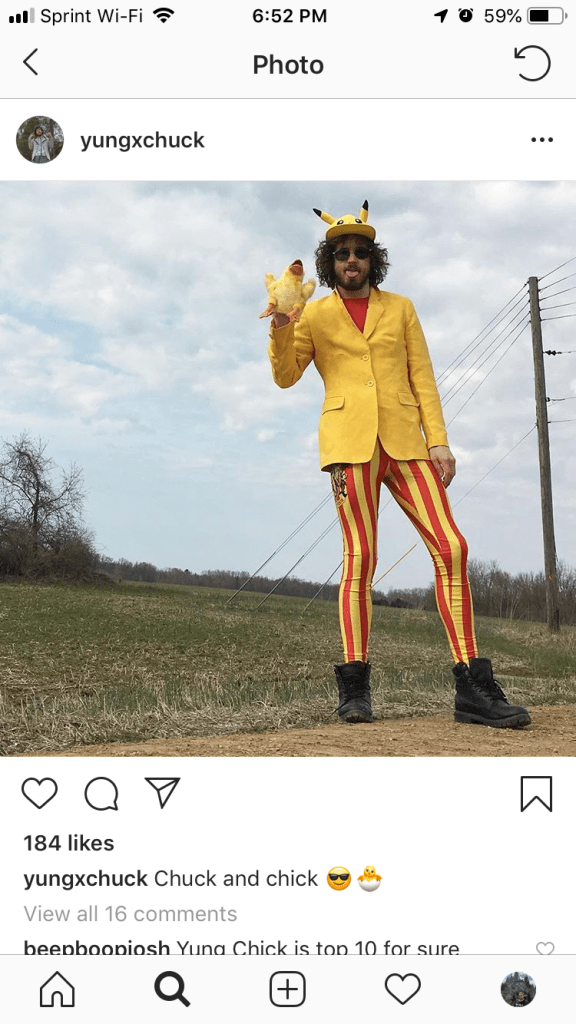 Yung Chuck really knows how to excel on social media. Back when I had Facebook, I remember his page being one of the best I followed. With all of the negativity and bullshit all over that site, his content was a breath of fresh air. From funny memes to funny videos to positive messages, he always has something great to post. After I stopped using Facebook, I was glad he to see he kept up the great content on Instagram. His Instagram page is even better than his Facebook ever was. I love the fact he creates his own memes and content and jokes, and everything he posts is so original. I really do not think you are going to find a page very similar to his on the app, and I mean that in the best possible way. Chuck has a slew of characters he has created, all with unique stories that get added on to. Some of my favorite recent characters are in this article. Currently, Chuck is hosting a bracket tournament of his best characters on his Instagram story, and I promise it is worth checking out. Oh yeah, and Chuck also make cooking tutorials! So if you follow him you may get lucky and catch one on his story one day.