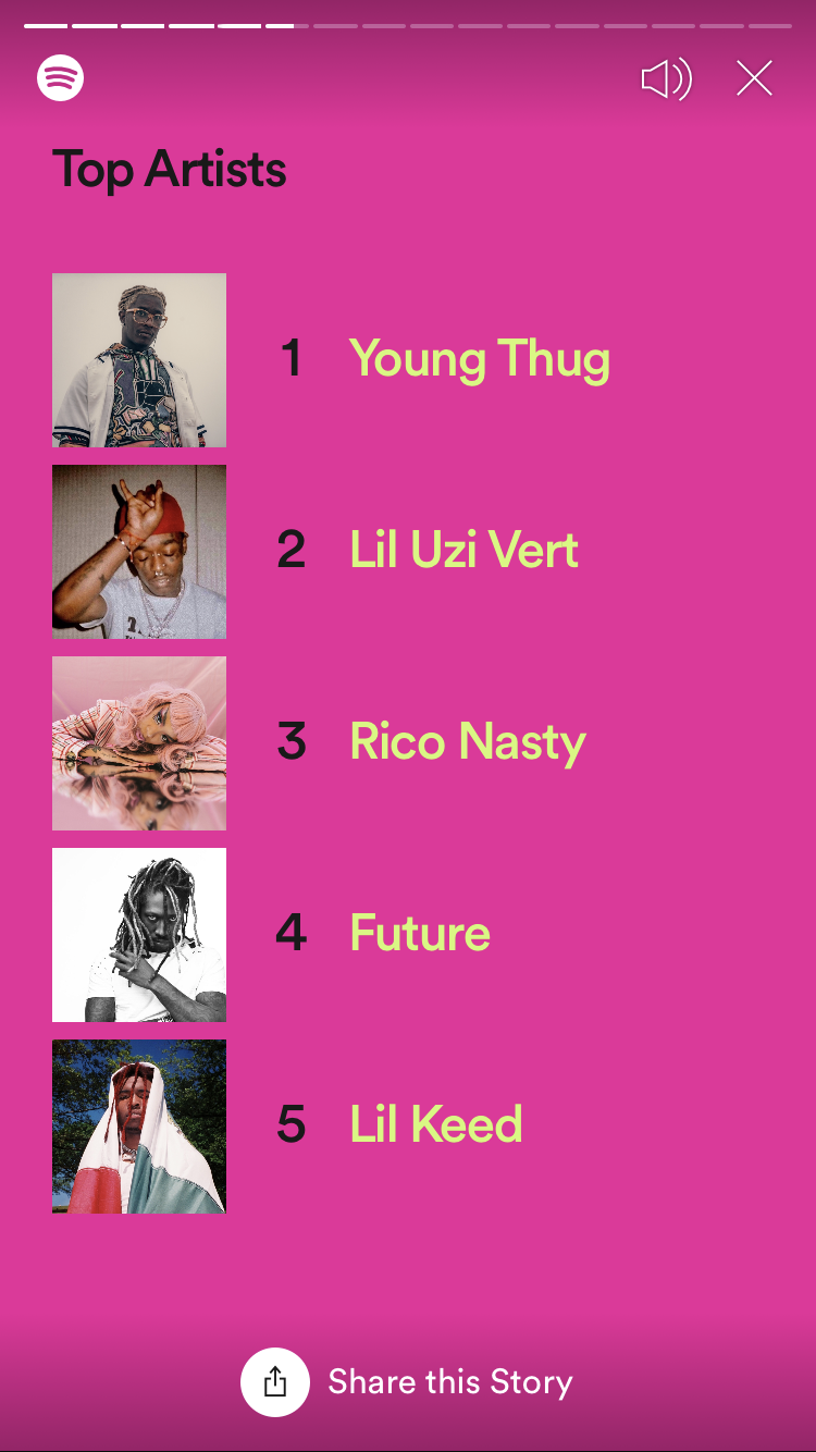 As I stated before, in 2019 I expanded what my pallet of what I listen to even more. Since I knew that I wanted to start this blog, starting in January I really tried to listen to as many kinds of music as possible. If you look at my stats, I think that it shows that I accomplished this goal pretty well. Even within pop-rap music itself, which is obviously my favorite genre from all of these stats, the artists that I listened to were different. I listened to more Young Thug this year than ever before, which is obviously a great thing; I think gravitating towards Thugger was almost subconscious for me, as Lil Wayne has always been my favorite rapper and Young Thug really is like the new version of Weezy. Because I got into Thugger so much this year, I seemed to listen to a ton of his frequent collaborators as well, mainly people like Future or rising stars like Lil Keed. My favorite thing about my top songs from 0f 2019 playlist is how many female artists I listened to this year. I mean, my love for pop music was as evident as ever, as quite a few of my favorite songs this year were by people like Carly Rae Jepsen, Charli XCX, Grimes, which is obviously not surprising. But I think it is cool that I listened to so much hip hop music being made by women. Hip Hop has been such a male-dominated genre forever, and it seemed like lady rappers would unfortunately never be considered more than a novelty in the grand scheme of the genre. 2019 has seen that idea turn on its head completely, with artists like Lizzo and Megan Thee Stallion becoming some of the biggest artists in the world this year. I personally really got into Rico Nasty’s music this year; I have known who she was for a while, but she truly became one of my favorite artists this year, as is evident from my favorite artists of 2019 list and playlist. There are so many other female artists in so many different genres I got into this year as well. I really started to dig alternative artists like Clairo and Beabadoobee, futuristic hyper-pop music like Slayyyter and LiZ, and rising female rap stars like Flo Milli and Tommy Genesis. Overall, 2019 was an excellent year for women in music, in turn making it an excellent year for music altogether. With so many musicians pushing their own boundaries and experimenting with bigger and bolder sounds, it seems like the music world is in great shape. I, for one, can’t wait to see what all of my favorite artists have in store for us next!